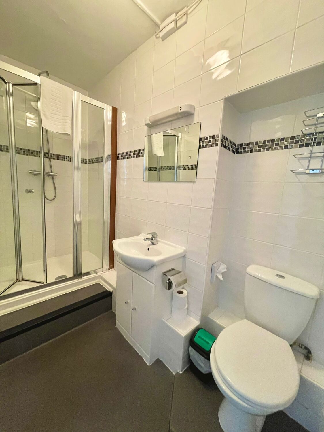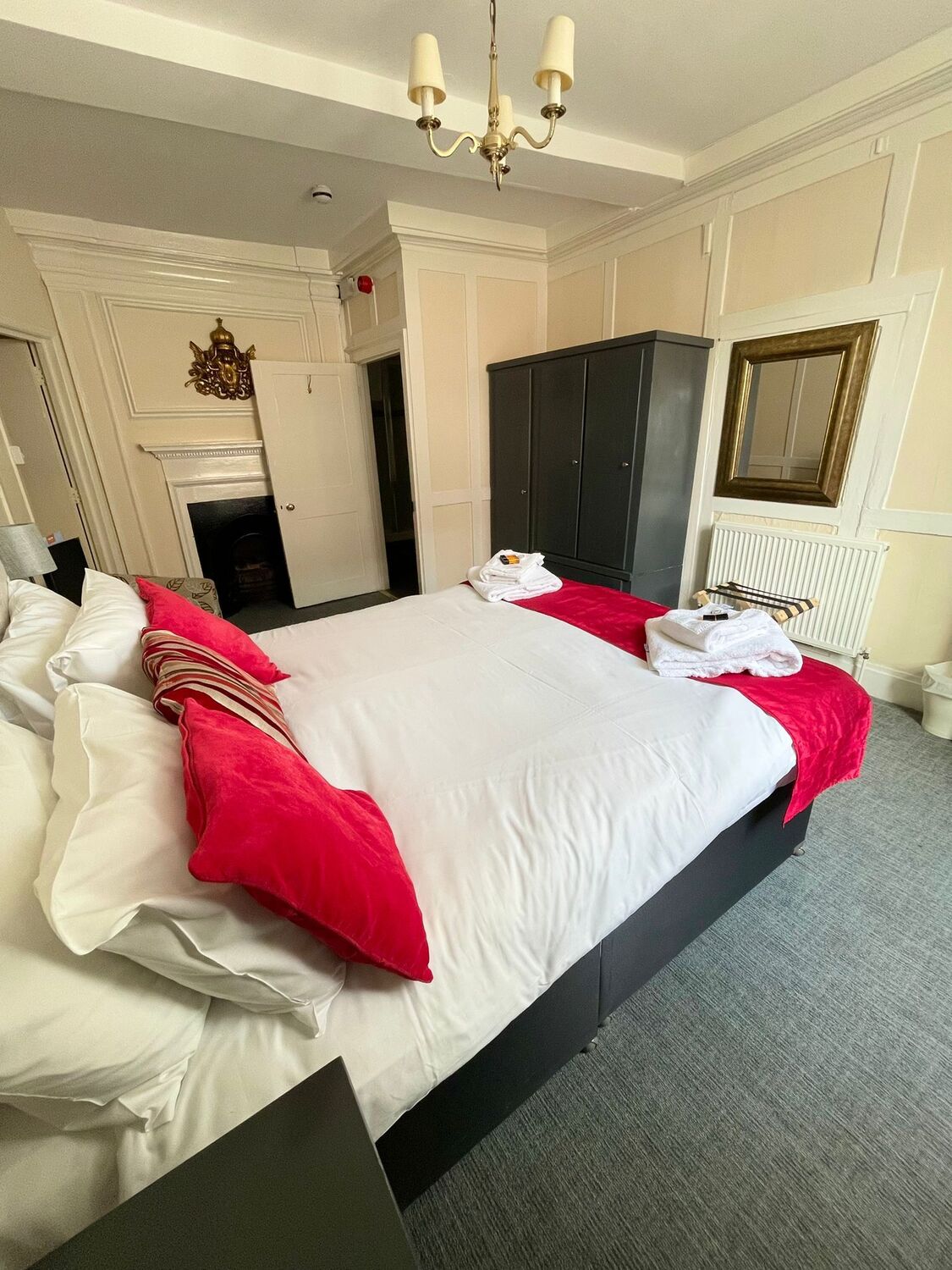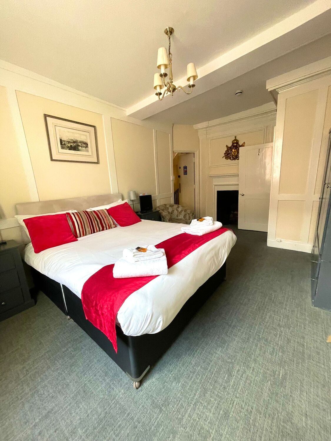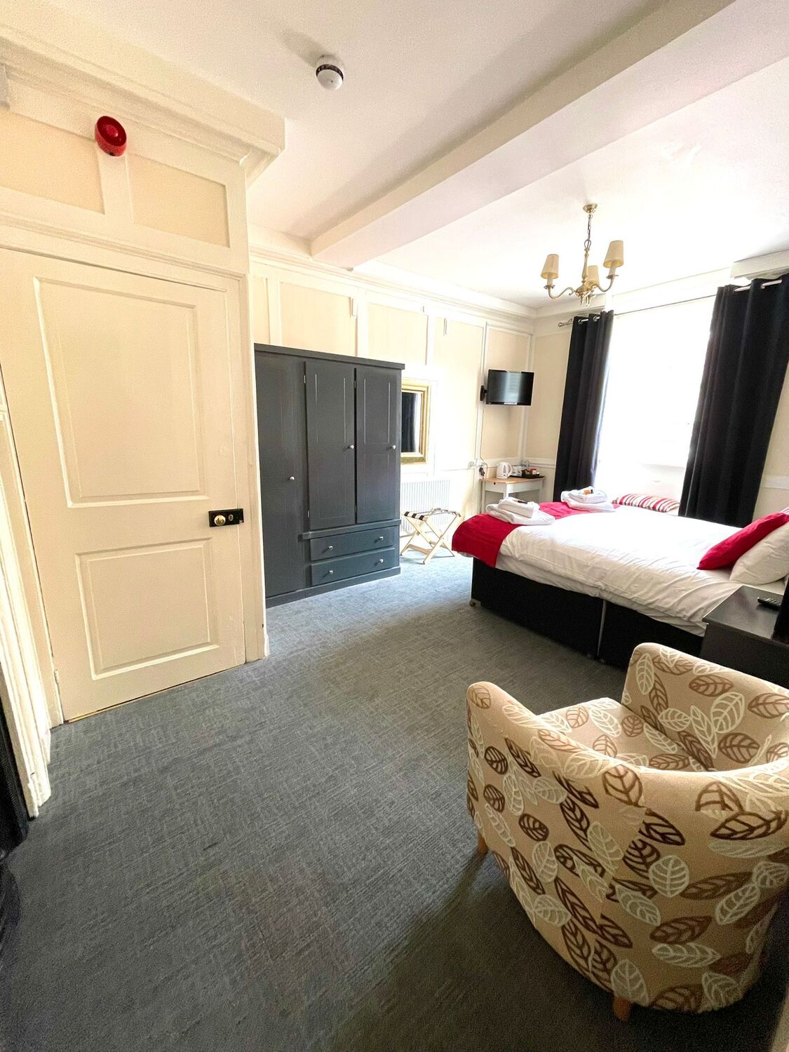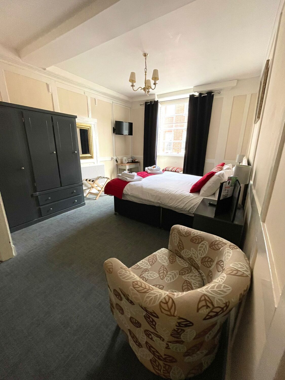 Spacious room with a King size bed, ensuite with double shower and complimentary toiletries. This room has recently been refurbished and is on the first floor overlooking the high street. Amenities include flat screen TV, hairdryer and Tea and Coffee making facilities. Breakfast and Parking are included in room booking. Fans and blankets are available on request.